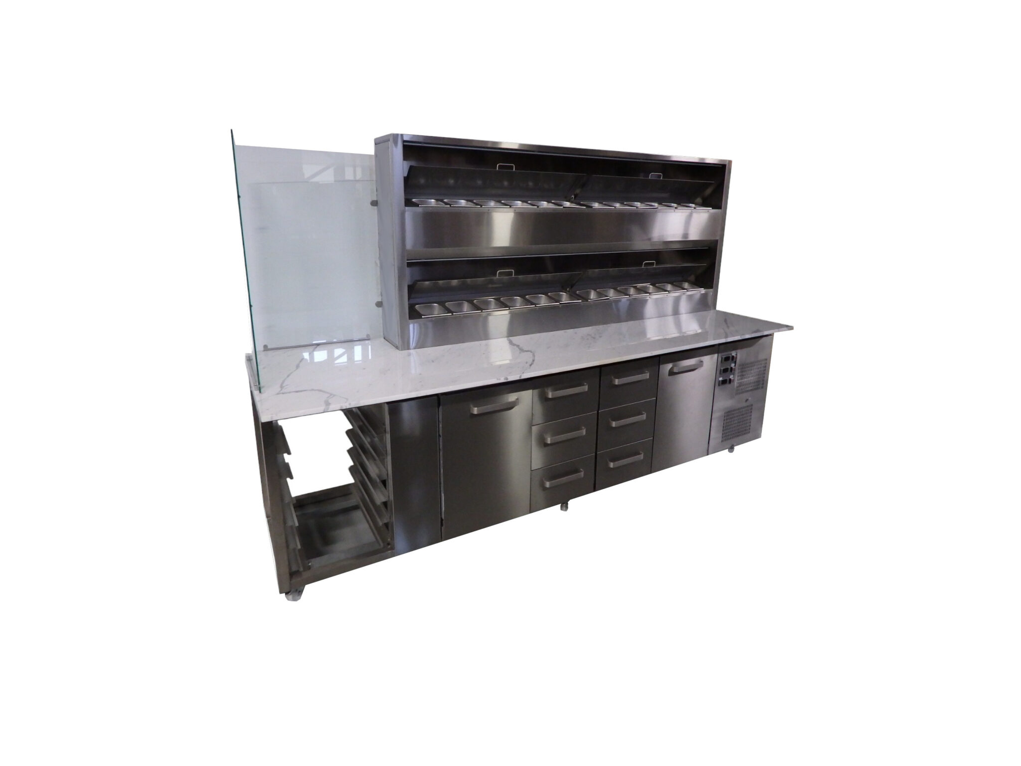 Leivontapöytä aitoa graniittia, erikoispinnan avulla helpotusta pizzojen avaamiseen. Pöydässä on kestävä graniittinen leivontataso, jonka päällä on 2 kerroksinen kylmähaude. Kylmähauteet on varustettu omilla lämpötilasäätimillä -1…+5˚C. Leivontataso varustettu lasisuojalla ja led-valaistuksella . Taikinakaappissa on 2 kerroksiset kiskot joihin mahtuu 1/1 GN-taikinapelti tai 40×60 cm leivontapelti. Yhdessä kaapissa on tilaa 8 pellille. Leivontatason alla erikseen neutraalit hyllyt taikinan nostattamista varten.
