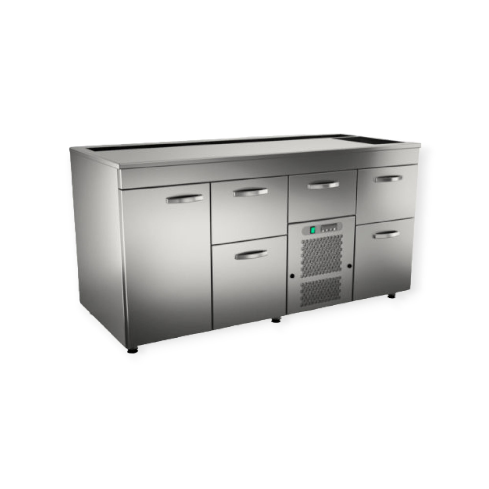 Laadukas baarimestarinpöytä on varustettu neljällä juomakoreille mitoitetulla ja yhdellä tölkeille mitoitetulla vetolaatikolla. Laatikoiden avautumismekanismista on tehty käyttäjäystävällinen.