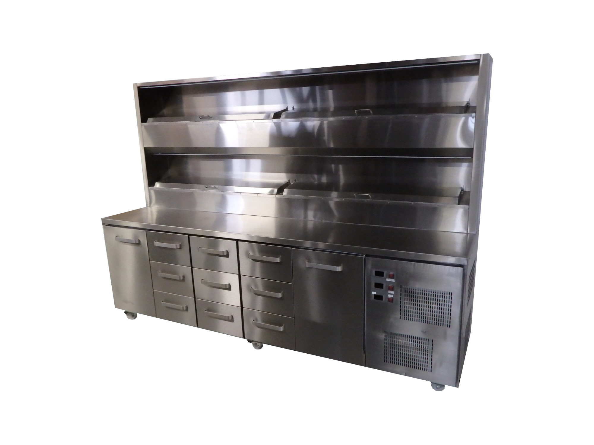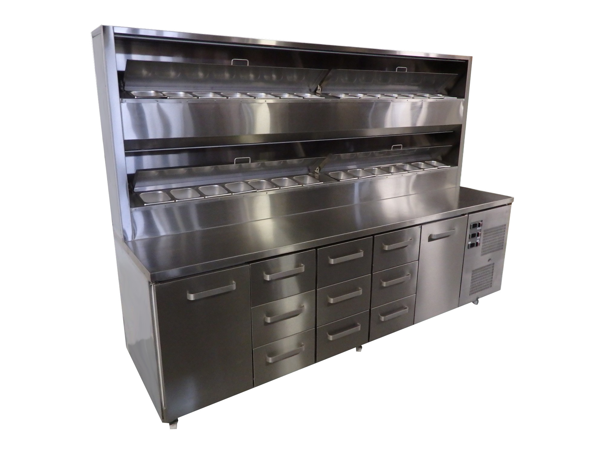 Työtaso on rosteria, soveltuu pizzan valmistukseen tai toimii tarvittaessa myös kylmäköntyöpöytänä. Työtason päällä on kylmähaude. Kylmähauteet on varustettu omilla lämpötilasäätimillä ja led-valoilla. Kylmähauteisiin mahtuu yhteensä 28x 1/6-150mm GN-astia. Taikinakaapeissa on 2 kerroksiset kiskot, joihin mahtuu 1/1 GN-taikinapelti tai 40x60cm leivontapelti, tilaa yhdessä kaapissa on 8:lle pellille.
