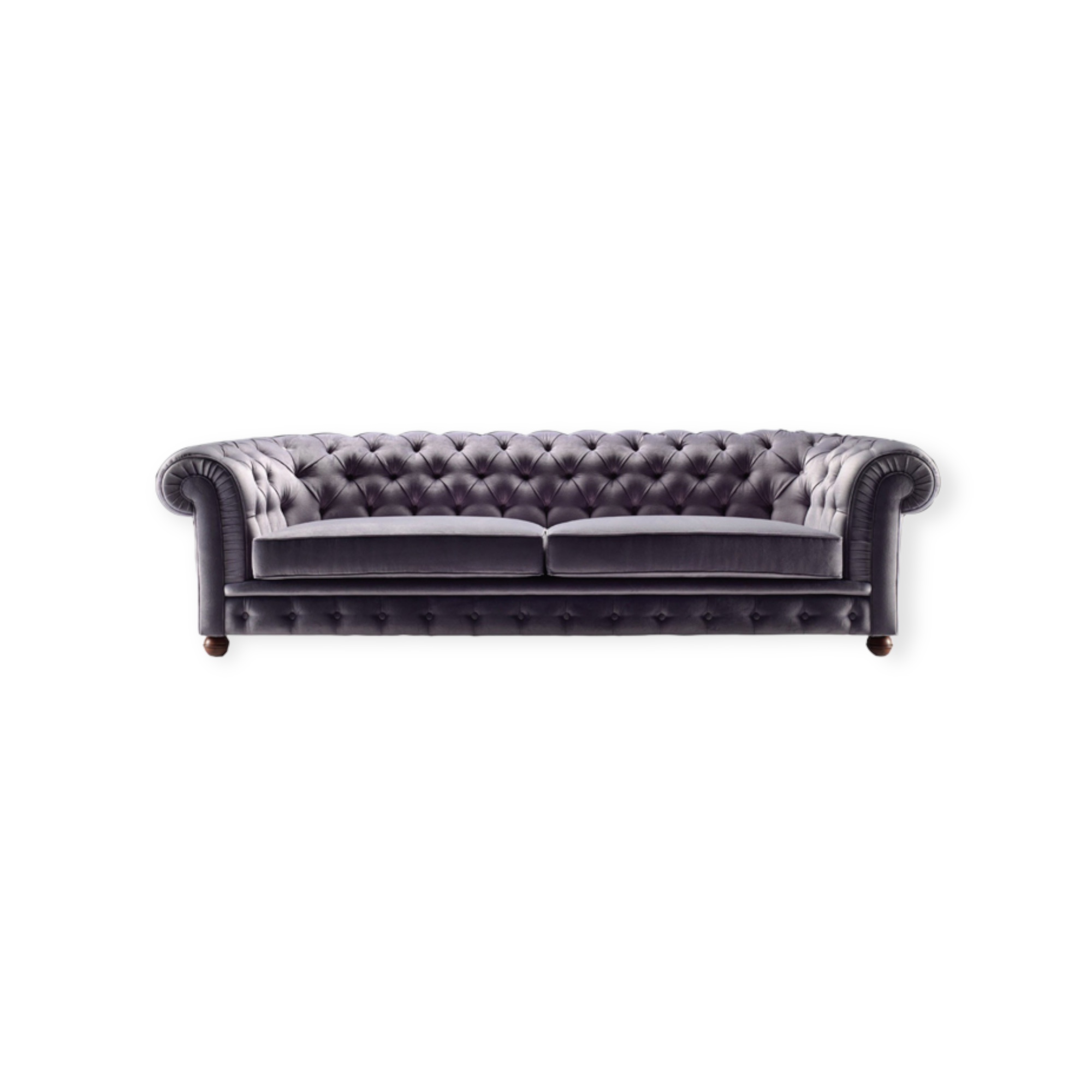 Ajaton Chesterfield-sohva Ametisti on verhoiltu pehmeällä kankaalla ja käsin napitettu.