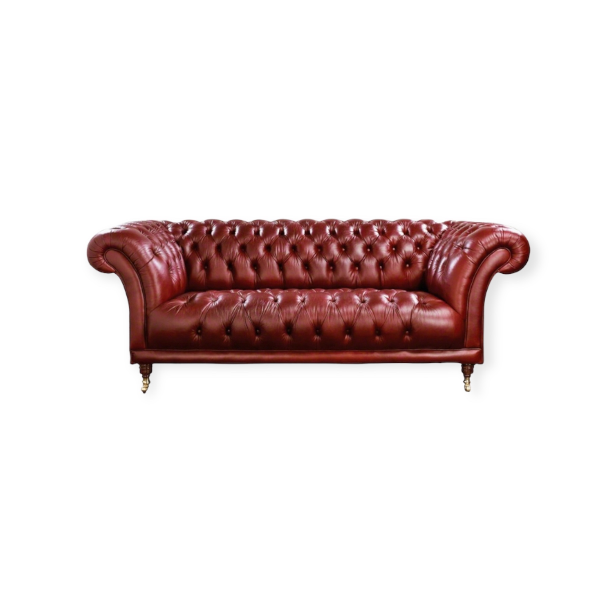 Tyylikäs Felix on kahden istuttava Chesterfield-sohva, joka on verhoiltu kauniilla punaruskealla keinonahkalla.