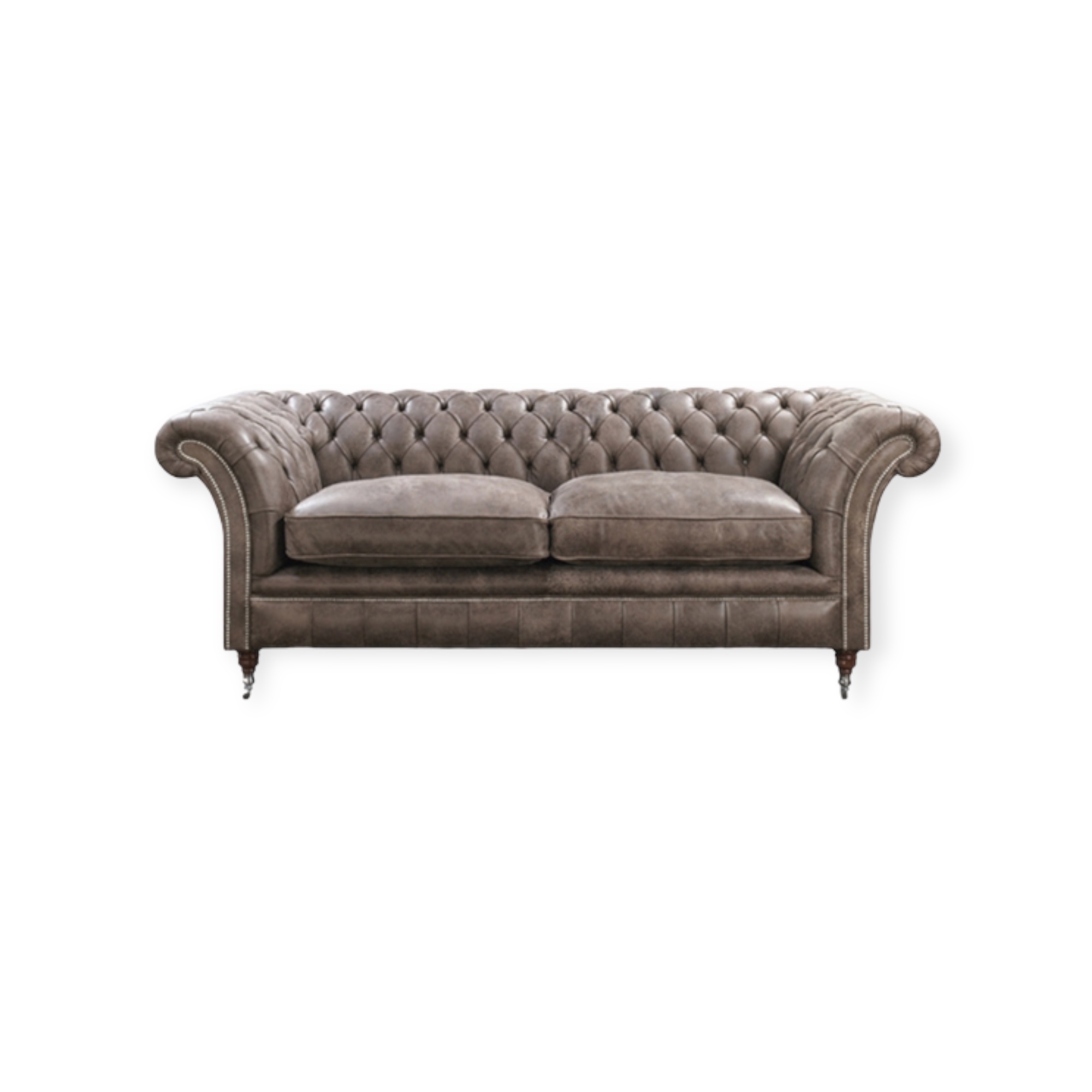 Klassinen Chesterfield-sohva Fortuna on verhoiltu kauniilla ruskeanharmaalla keinonahalla.
