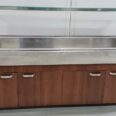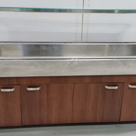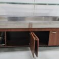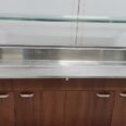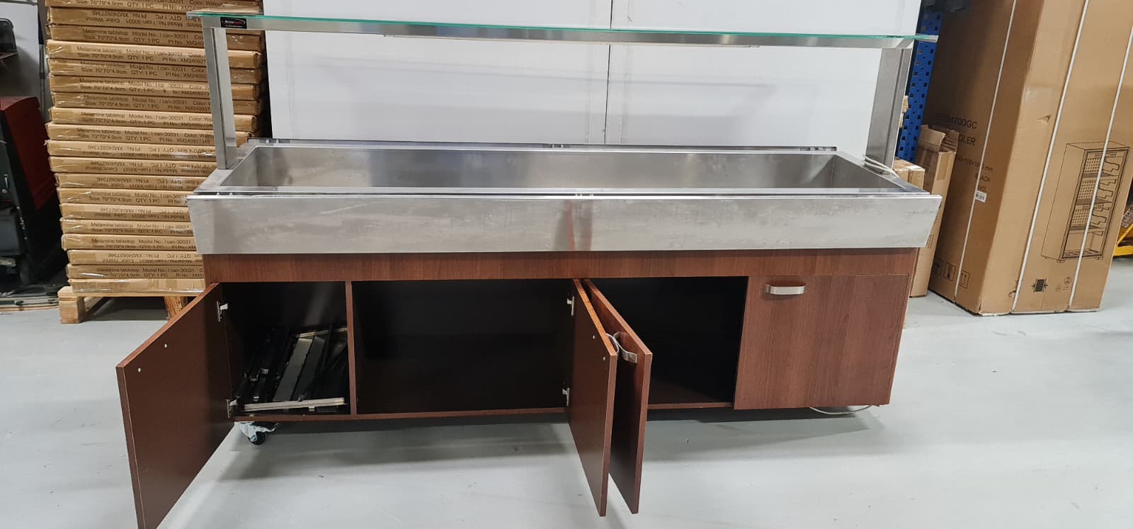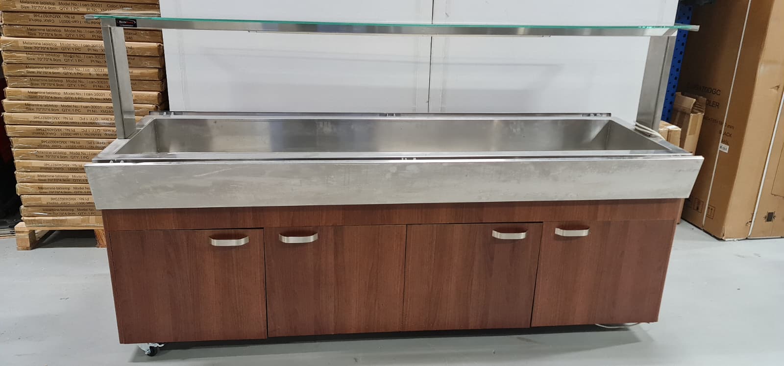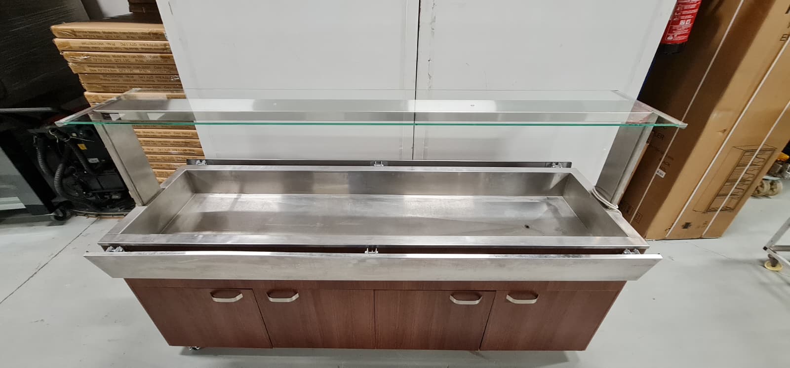 Toimiva hyvä 6-GN lämmin buffa. Mitat: 220x76x131 cm.