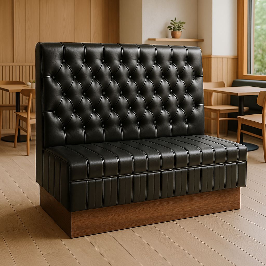 Sohva on verhoiltu mustalla keinonahalla, joka on muotoiltu selkänojasta.