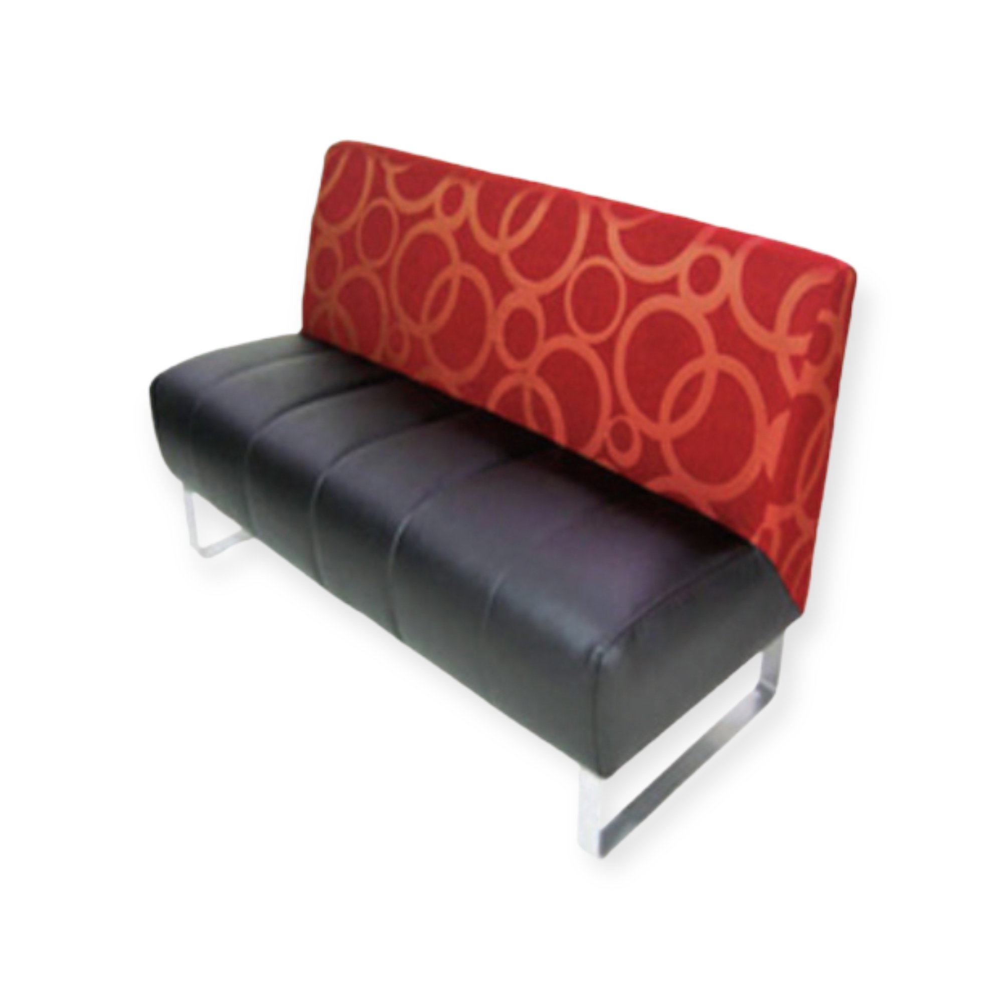Kahden istuttava loosisohva Jinx on verhoiltu selkänojasta punaisella kuviokankaalla sekä istuinosasta mustalla keinonahalla.