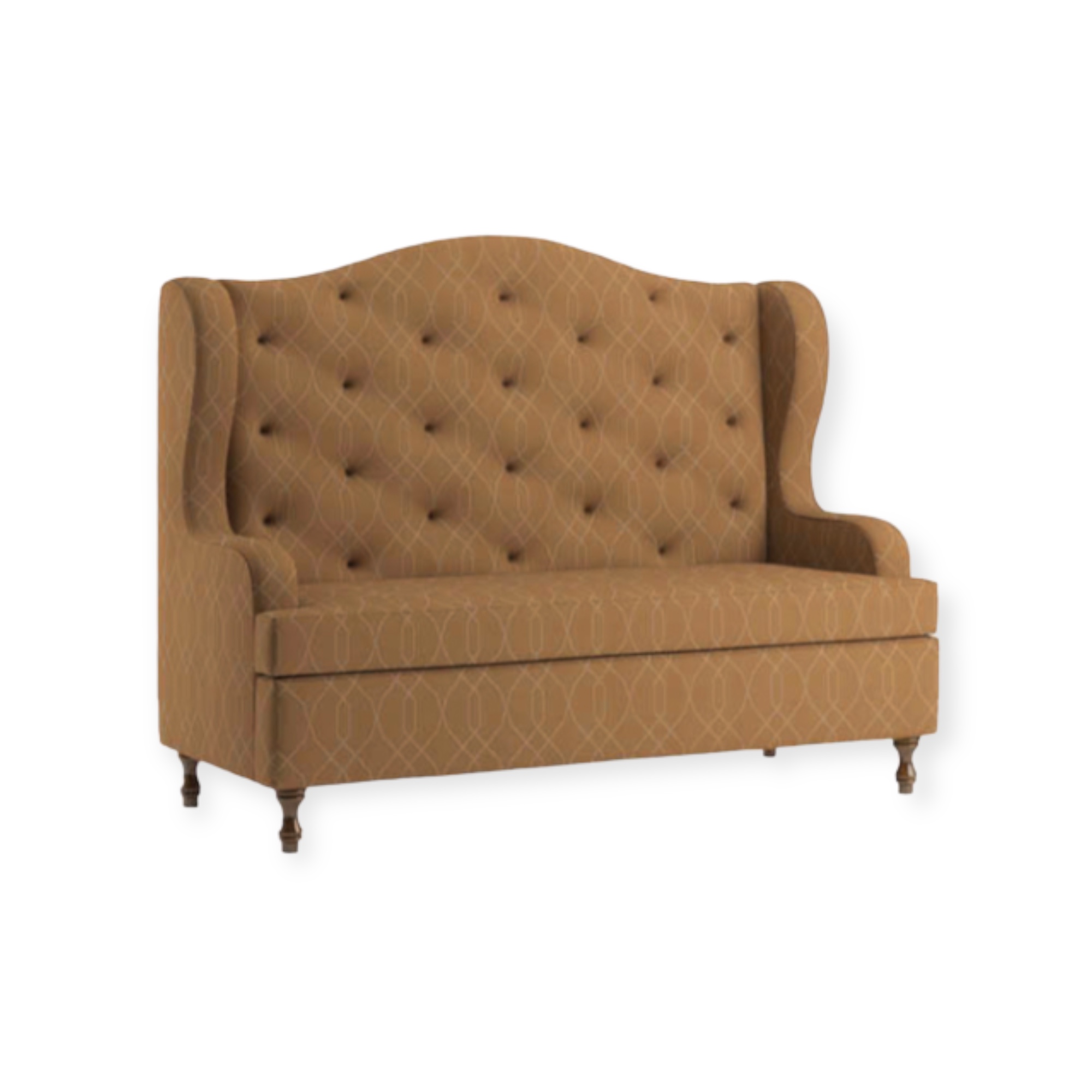 Se on verhoiltu ruskealla kuviokankaalla, joka korostuu selkänojan napituksilla sekä käsinojien kauniilla aalto muotoilulla.
