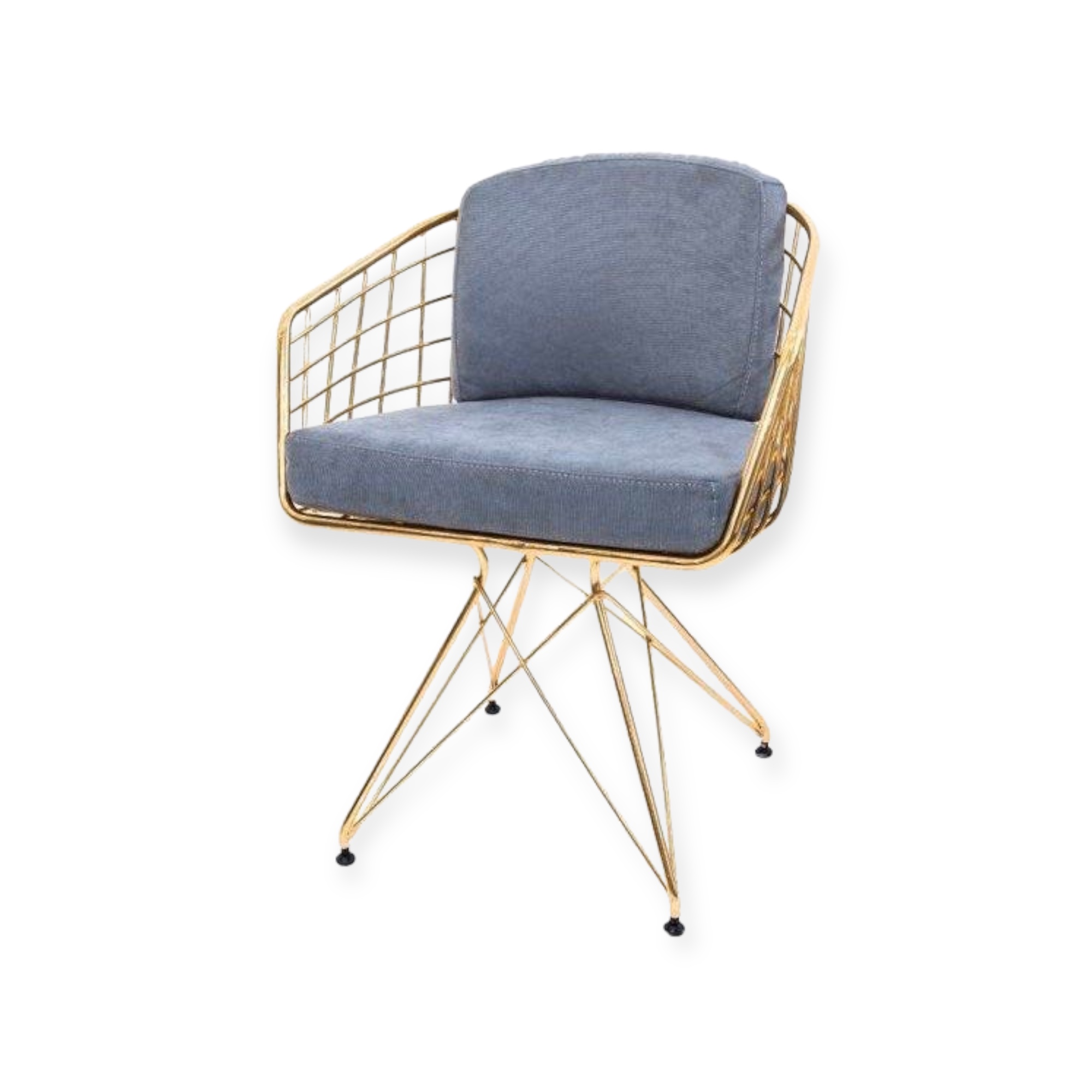 Tämä kullanvärinen metallirunkoinen tuoli on erinomainen valinta moneen sisustukseen. Pehmeät sinisellä materiaalilla verhoillut istuinpehmusteet takaavat miellyttävän käyttökokemuksen.