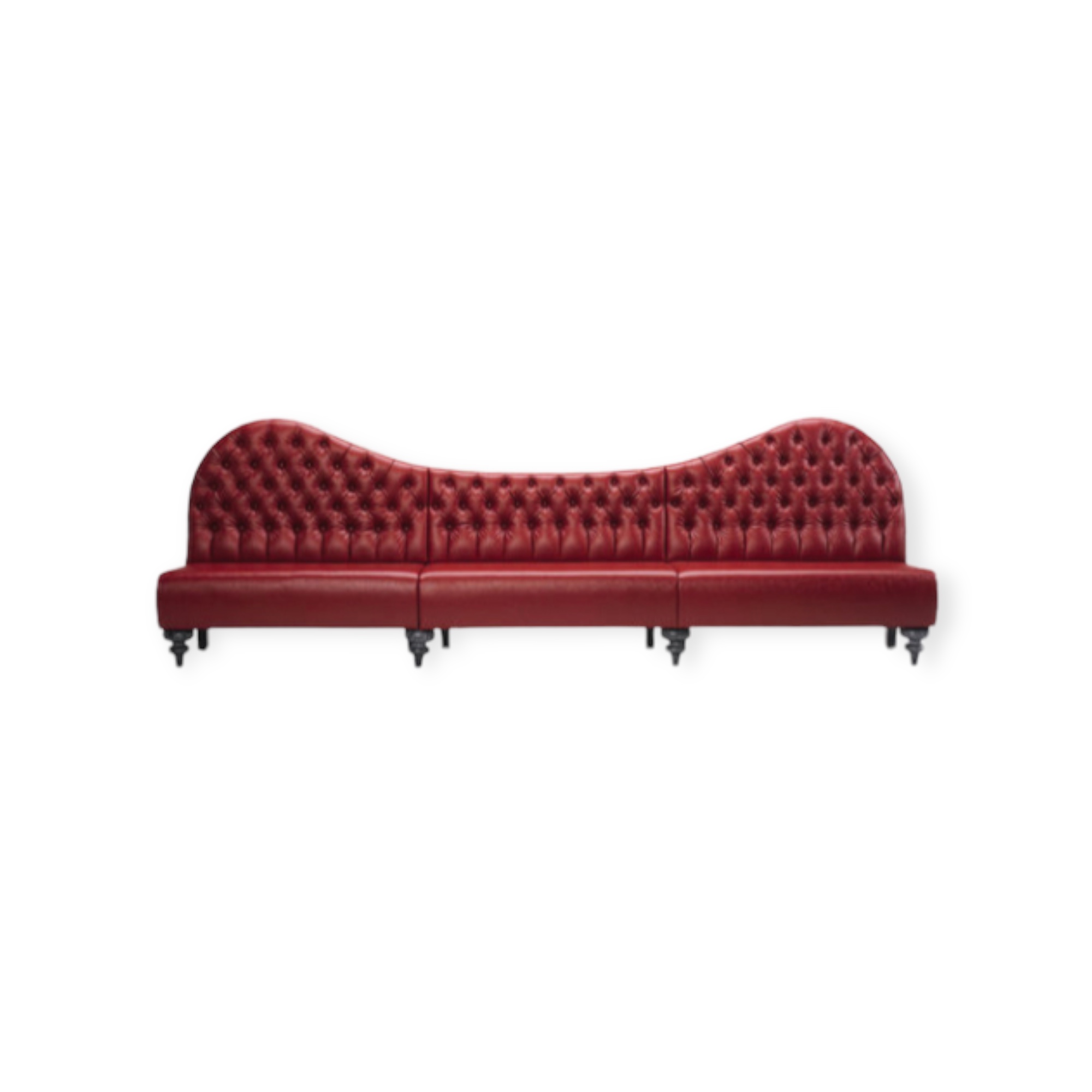 Sohva on verhoiltu viininpunaisella nupukkinahalla, joka on napitettu selkänojasta.