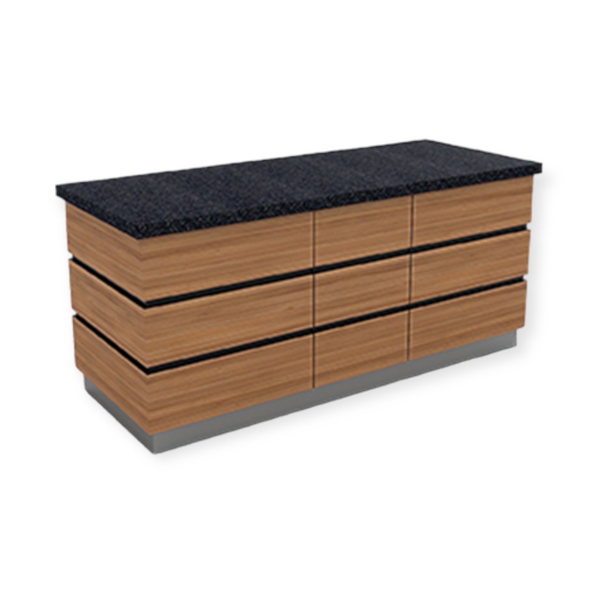 Neutraali pöytä puisella rungolla sekä tyylikkäällä aidolla graniittitasolla.