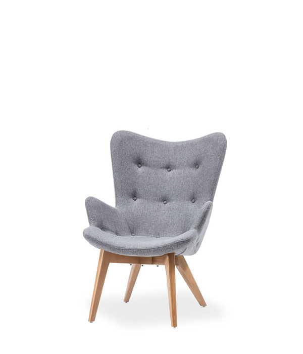 Arma on tyylikäs ja neutraali palosuojatulla harmaalla kankaalla verhoiltu nojatuoli.