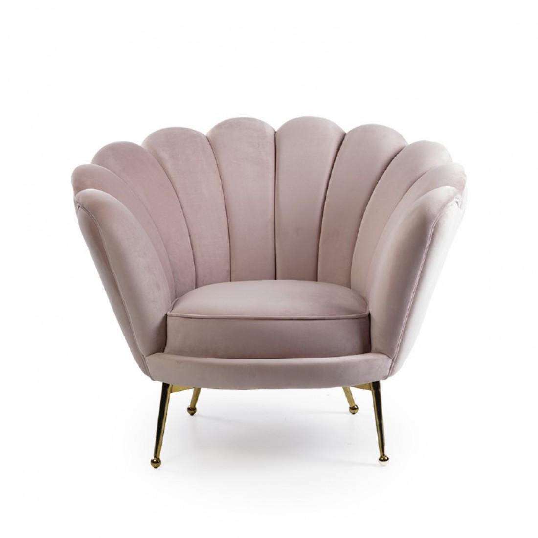 Doren on tyylikkäästi muotoiltu vaalea nojatuoli, jonka selkämys muistuttaa näkinkenkää.