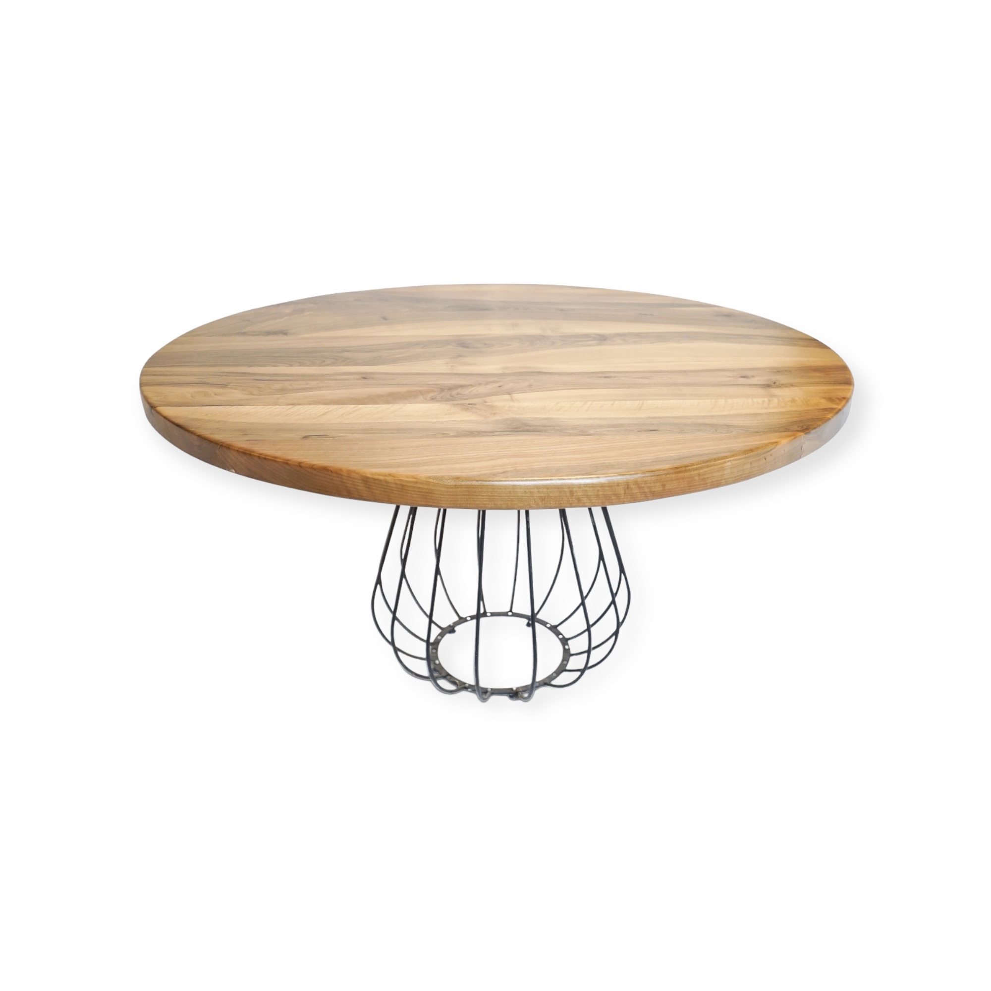 Massiivipuusta valmistettua pöydänkantta kannattelee valurautarunko.