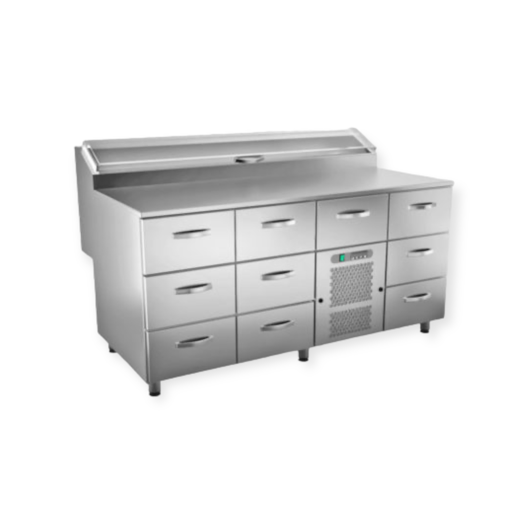 Laadukas pizzanleivontapöytä sisältää muun muassa kylmäkaukalon, teleskooppikiskot sekä kätevän kokoiset laatikot.
