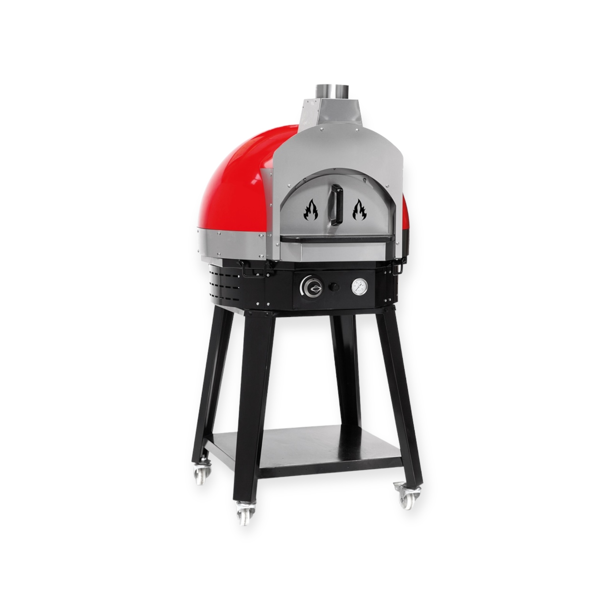 Näyttävä elävän tulen kaasulämmitteinen pizzauuni 4 pizzalle. Pienille keittiölle tarkoitettu näyttävä miniuuni.