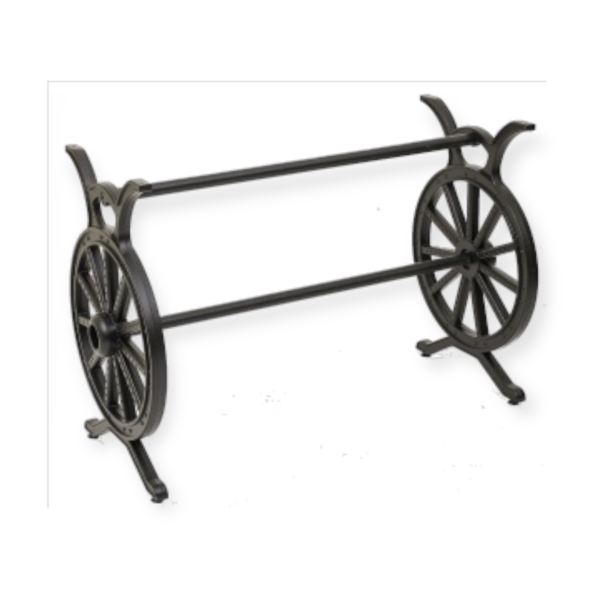Valurautainen vaunupyörien tapaan muotoiltu pöydänjalkayhdistelmä soveltuu esimerkiksi kahvila-, ravintola-, hotelli- ja terassikäyttöön.