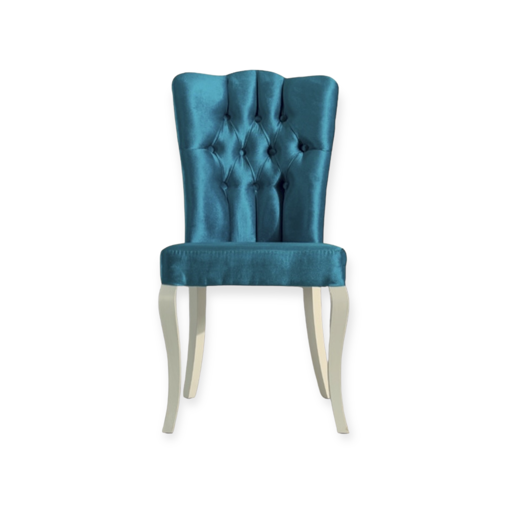 Intron kauniisti muotoiltu selkänoja on verhoiltu merensinisellä kankaalla sekä on käsin napitettu.