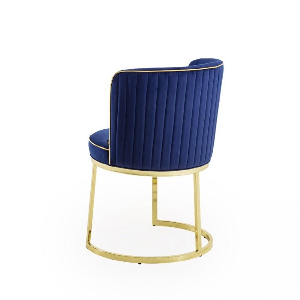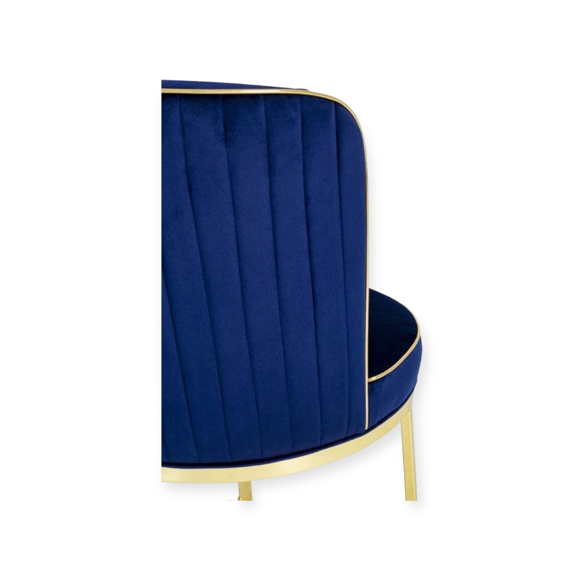 Syvänsininen Janne-tuoli on koristeltu kullanvärisillä yksityiskohdilla ja sirolla metalli jalalla.