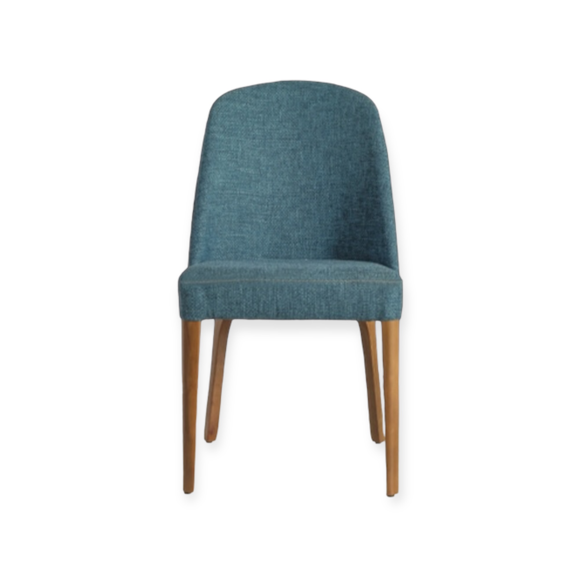 Karolina on siniharmaalla kankaalla verhoiltu sekä ruskeasta pyökkipuusta valmistettu tuoli.
