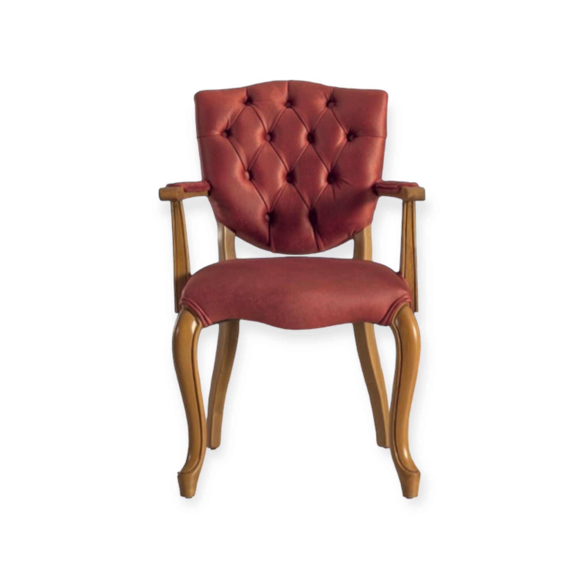 Linnan muotoiltu selkänoja on verhoiltu punaruskealla nupukkinahalla, ja se on käsin napitettu.
