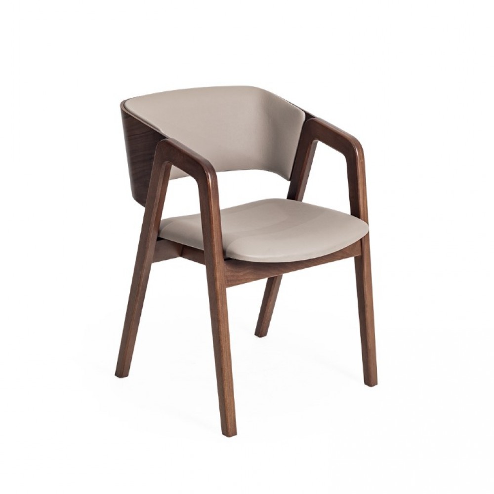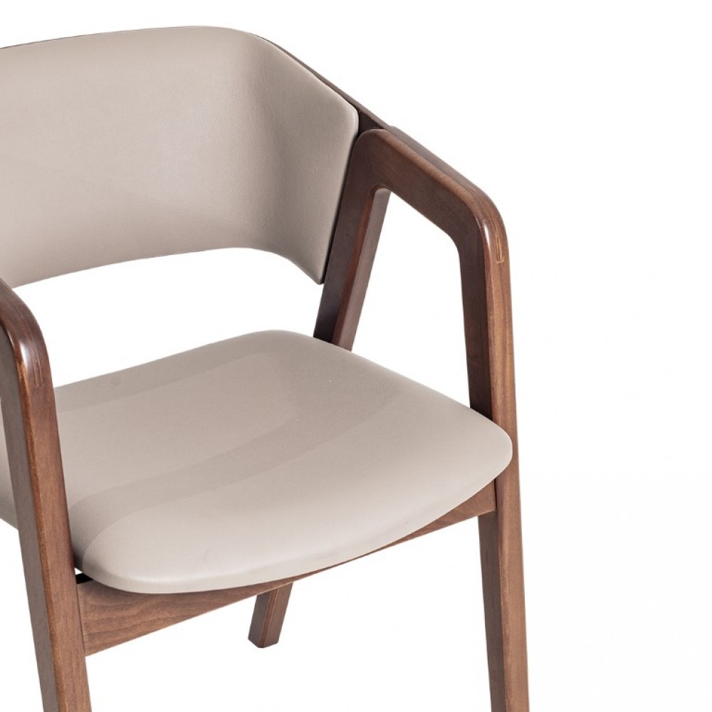 Puunvärinen runko on tukeva ja istuimen ja selkänojan pehmusteet on verhoiltu neutraalin vaaleiksi.