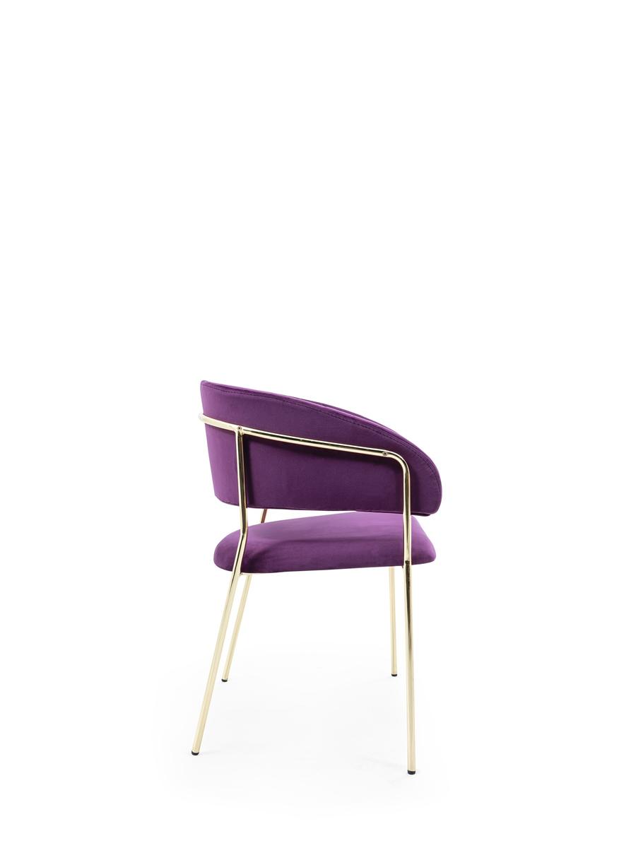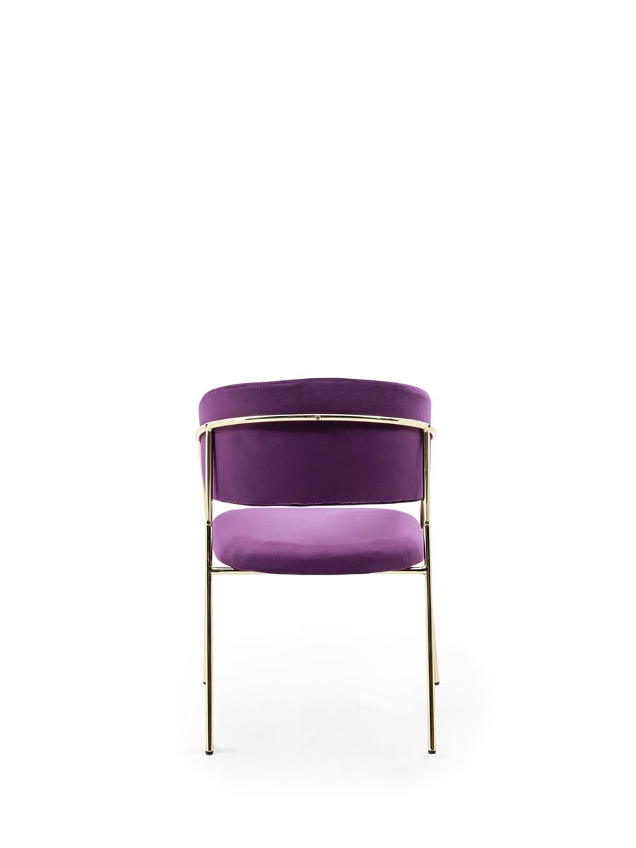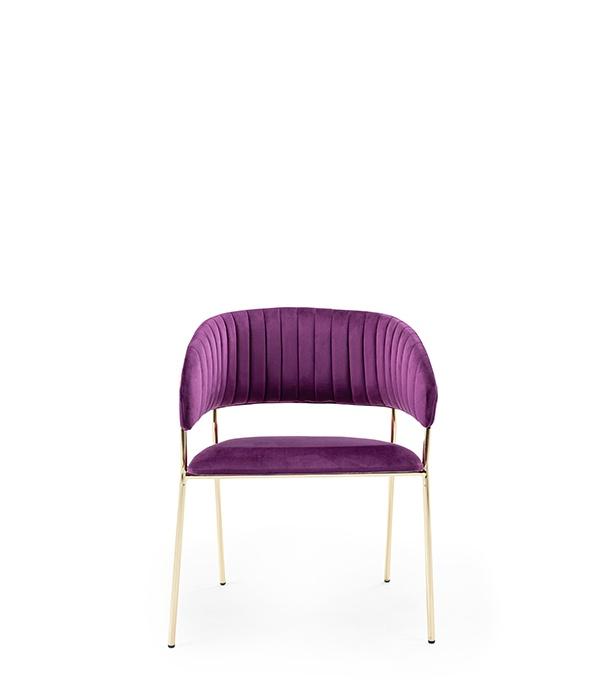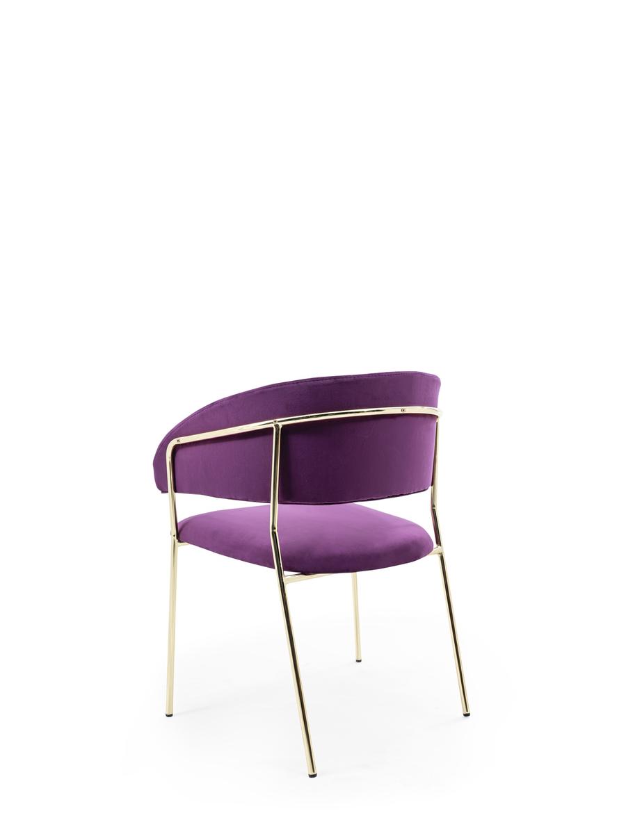 Nelson on eloisan värinen ja erottuvasti muotoiltu tuoli violetilla pehmusteella.