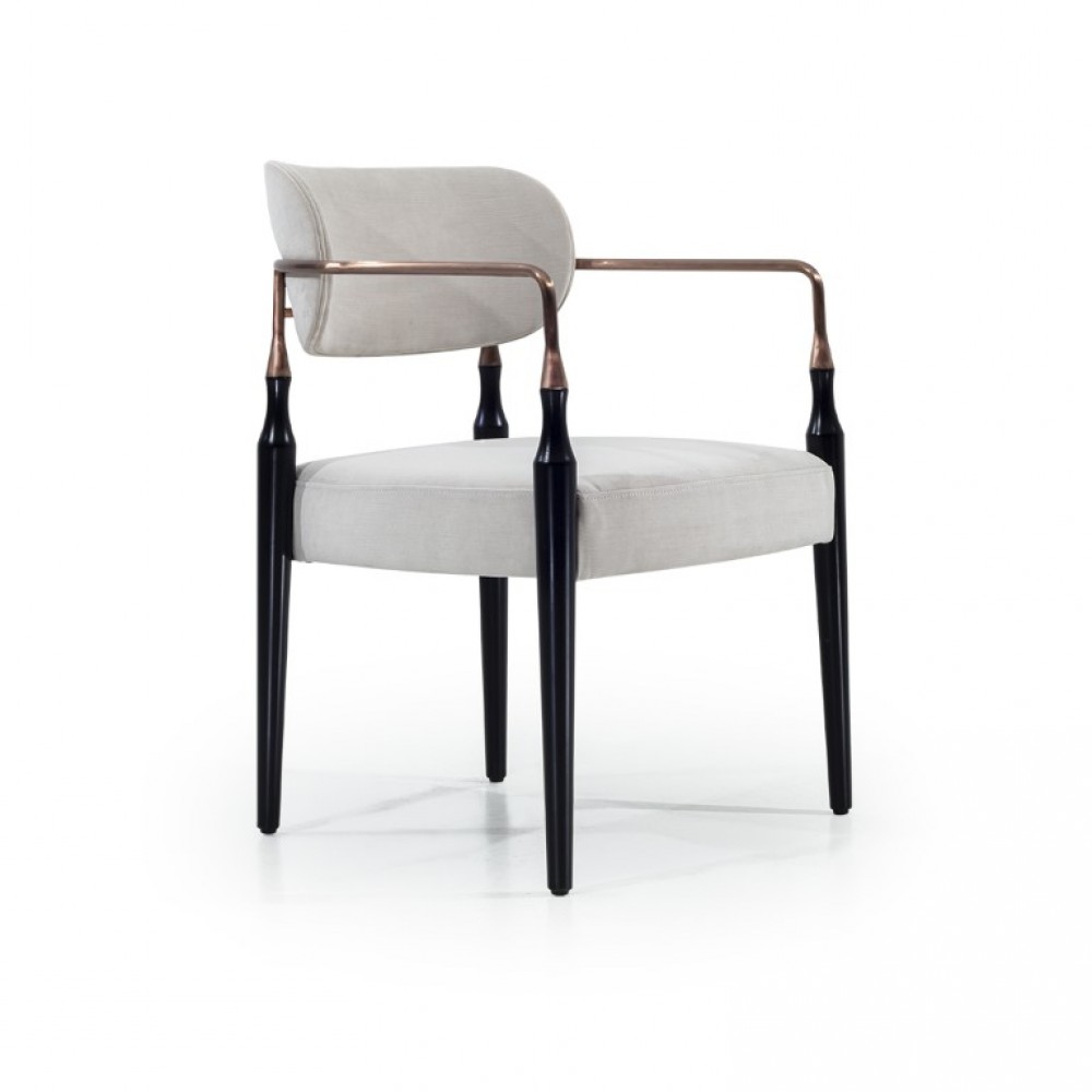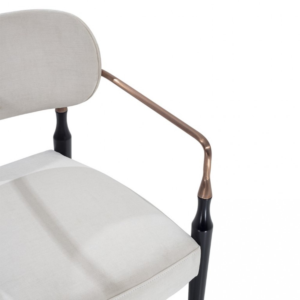 Orante on erottuvasti muotoiltu metallisilla jaloilla ja käsinojilla koristeltu tuoli, jonka pehmusteet on verhoiltu valkoisiksi.