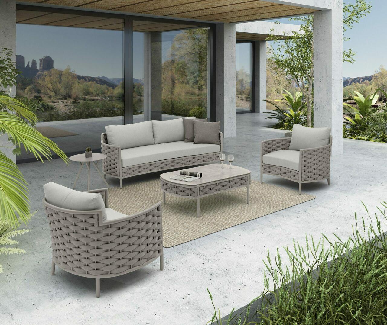 Tämä ylellinen Royal Garden sohvaryhmä on arvokas lisä terassisi sisustukseen. Sisältää kaksi nojatuolia, kahden hengen istuttavan sohvan ja pöydän. Istuin- ja selkätyynyt sisältyvät settiin.