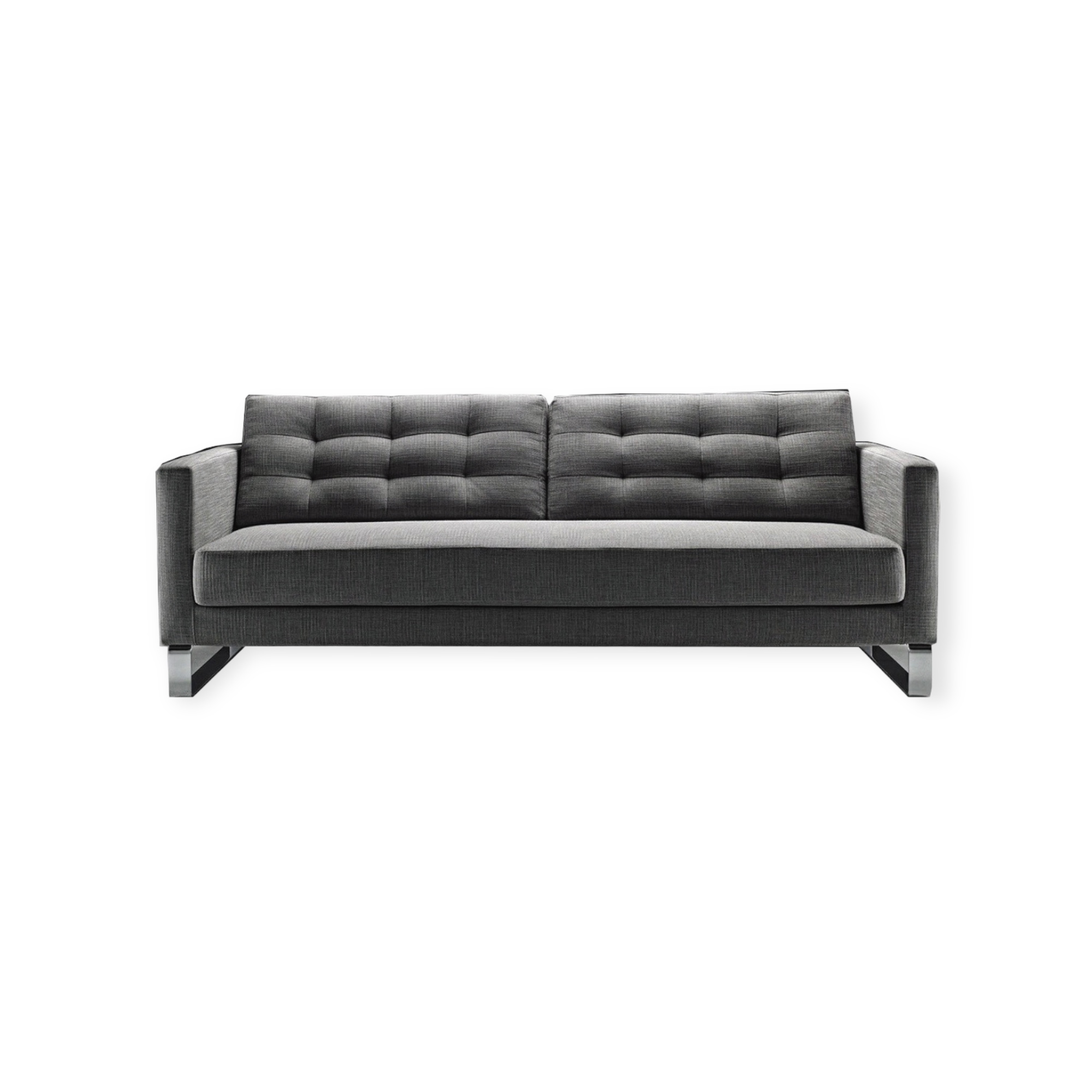 Moderni Cledos-sohva on verhoiltu harmaalla polyesteri kankaalla.