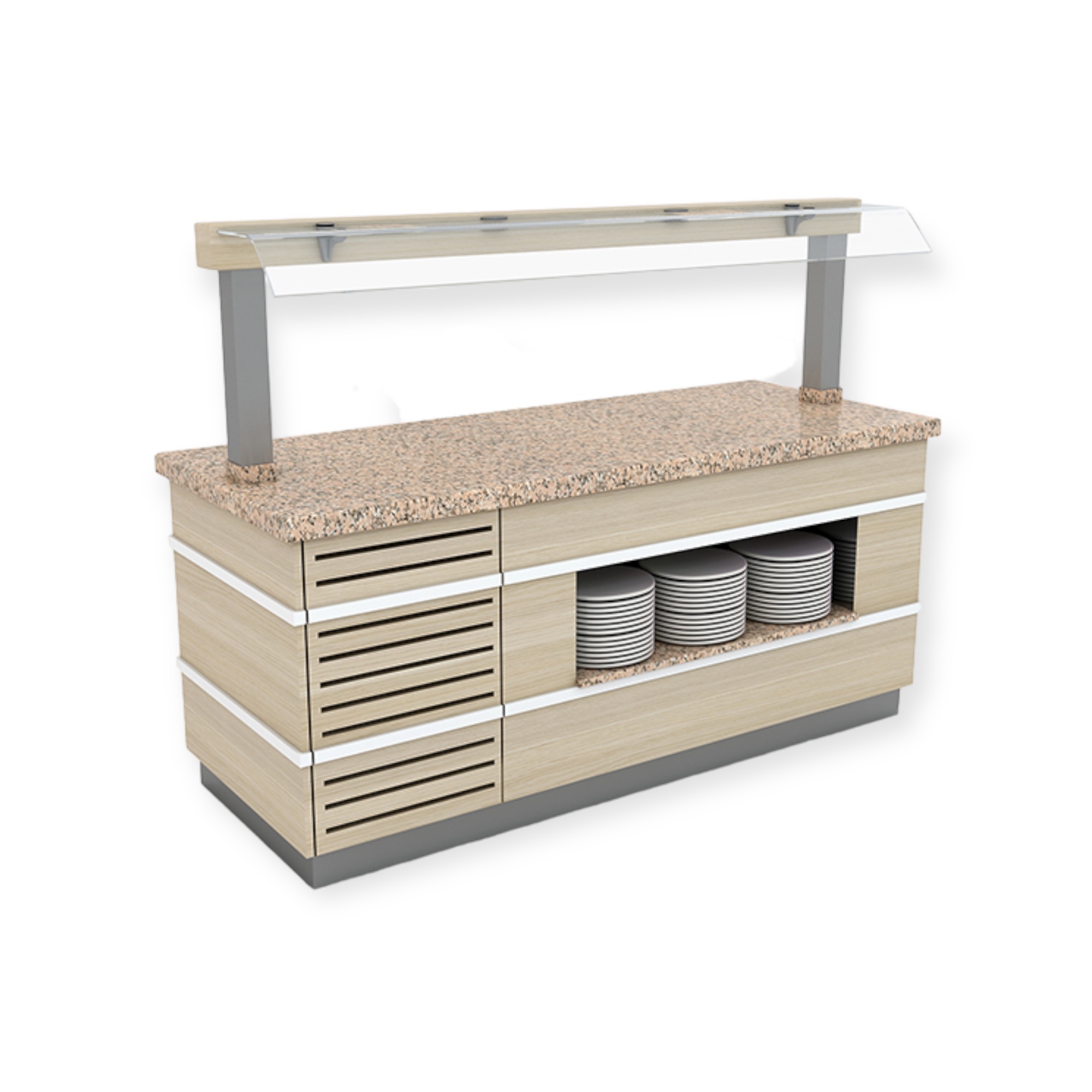 Sushi-kylmäbuffetvaunu tyylikkäillä aidoilla graniittitasoilla ja huurretasolla, saatavana vakiomalleina tai räätälöitynä mittaustilaustyönä.