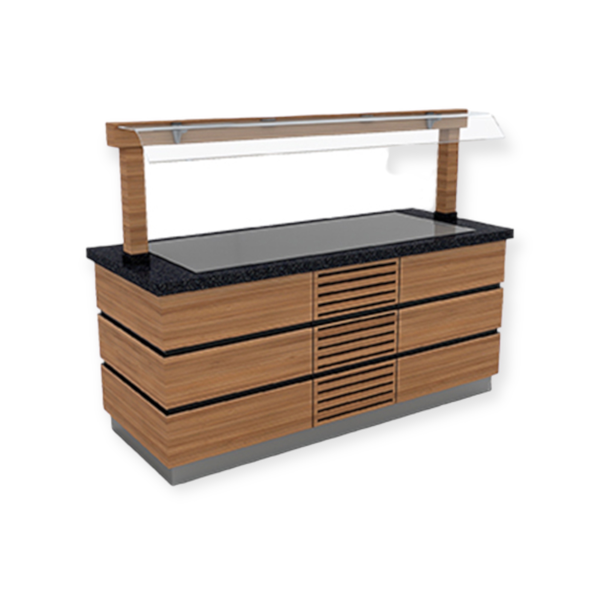 Sushi-kylmäbuffetvaunu hurretasolla ja tyylikkäillä aidoilla graniittitasoilla, saatavilla vakiomalleina tai räätälöitynä mittaustilaustyönä.